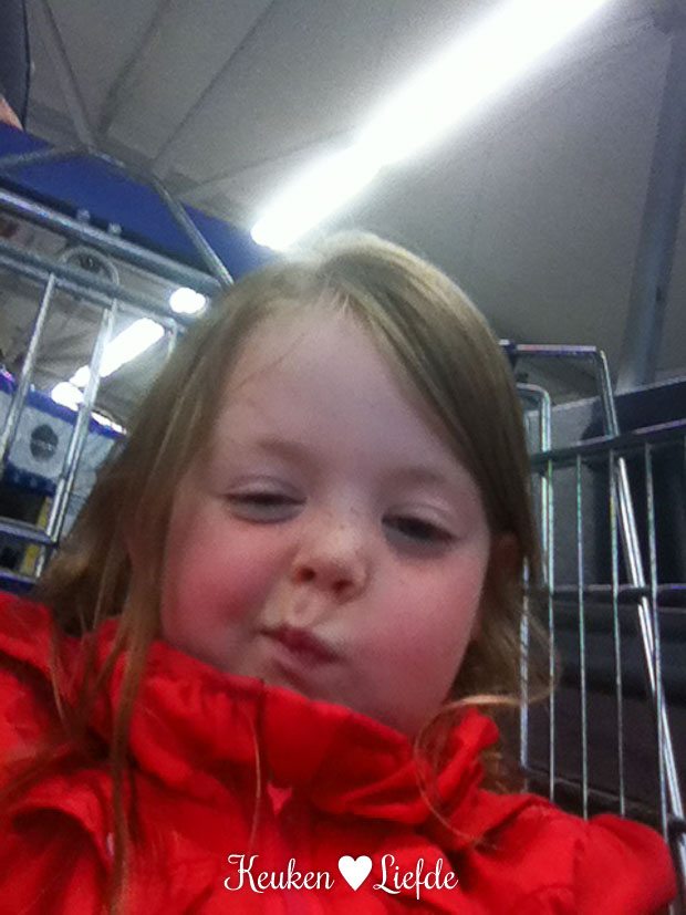 Nadat ik El ’s middags uit school heb gehaald, gaan we boodschappen doen. El zit tijdens het winkelen in het karretje een spelletje te spelen op mijn telefoon. Uhm, not! Bij het uitzoeken van deze achter-de-schermen-foto’s kom ik erachter dat ze selfies heeft zitten maken. Jong geleerd …