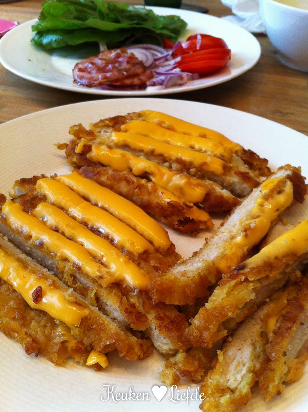 - Krokante kipschnitzel met gesmolten cheddar. Jumm!