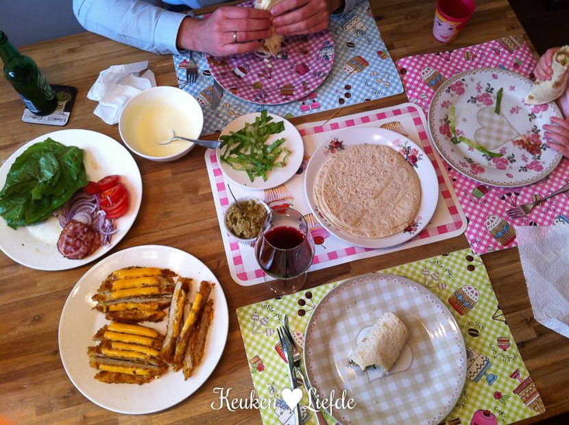 ’s Avonds eten we wraps met krokant gebakken kipschnitzel. Zo simpel en zo lekker!