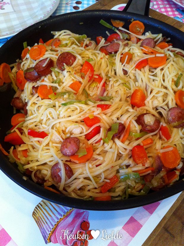 Het recept is supersimpel. Bami koken. Ondertussen in een koekenpan plakjes rookworst bakken, dan groenten erbij (ik had wortel, prei, paprika, ui en witte kool) en kort even meebakken. Bouillonblokje eroverheen verkruimelen, kop water erbij en zachtjes groenten gaar smoren. Bami toevoegen samen met een flinke kneep zoete chilisaus. Omhusselen en serveren.