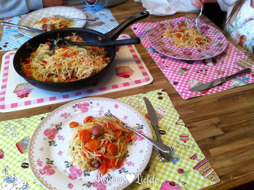 Ik heb vandaag geen zin om boodschappen te doen en ga op speurtocht in de kelder. Ik vind een half pak bami en uit de vriezer vis ik wat gesneden groenten en een rookworst. Een half uur later genieten we van een verrassend lekker maaltje. Koken met wat je in huis hebt levert altijd weer de meest verrassende en heerlijke creaties op. Ik hou ervan!