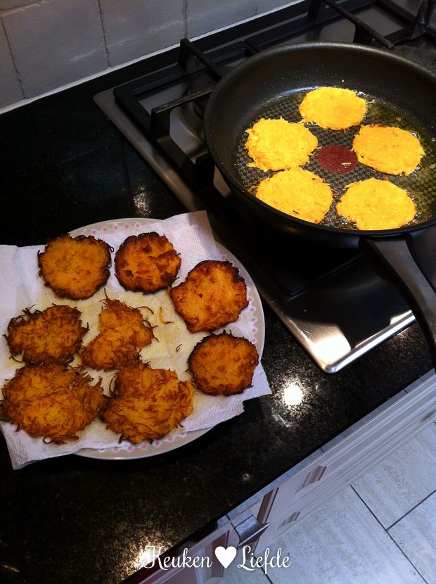 ’s Ochtends sta ik opnieuw in de keuken om te bakken. Ik bak pompoen-rostirondjes die een onderdeel gaan vormen van een nieuw Spijs & Wijn gerecht. Omdat dit recept de meeste tijd in beslag neemt, bak ik ze alvast in het voren. Als ze eenmaal zijn afgekoeld bewaar ik ze tot gebruik in de koelkast.