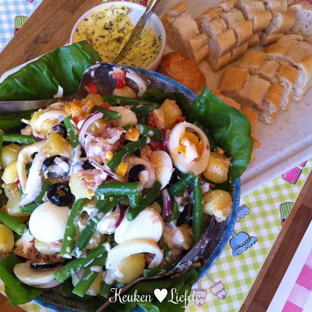 Voor het avondeten maak ik een krieltjessalade met tonijn en sperziebonen. Ik serveer er stokbrood met kruidenboter bij.