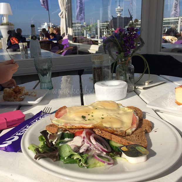 Halverwege de middag strijken we neer in één van de vele strandtentjes die de boulevard van Scheveningen rijk is. We eten appeltaart en New York cheesecake met slagroom en een uitsmijter. Je kunt vast wel raden wie wat heeft … 🙂 We sluiten af met een lekker wijntje.