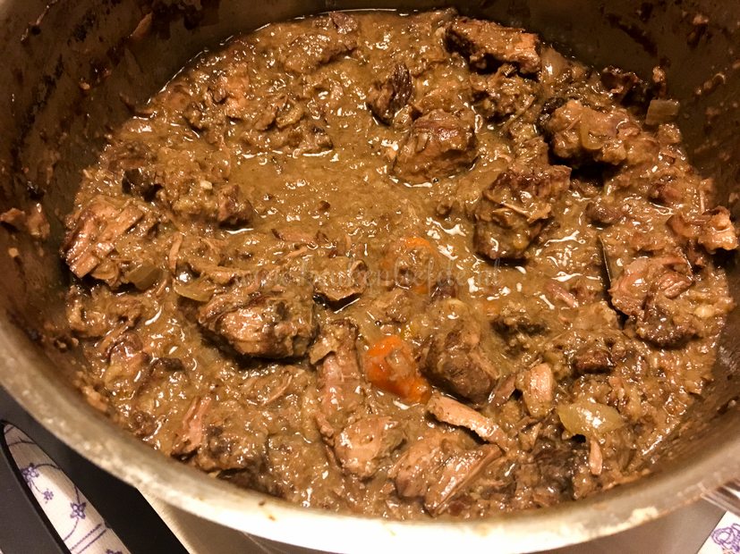 We eten ’s avonds het laatste restje rodekoolstamppot met rookworst erbij.
