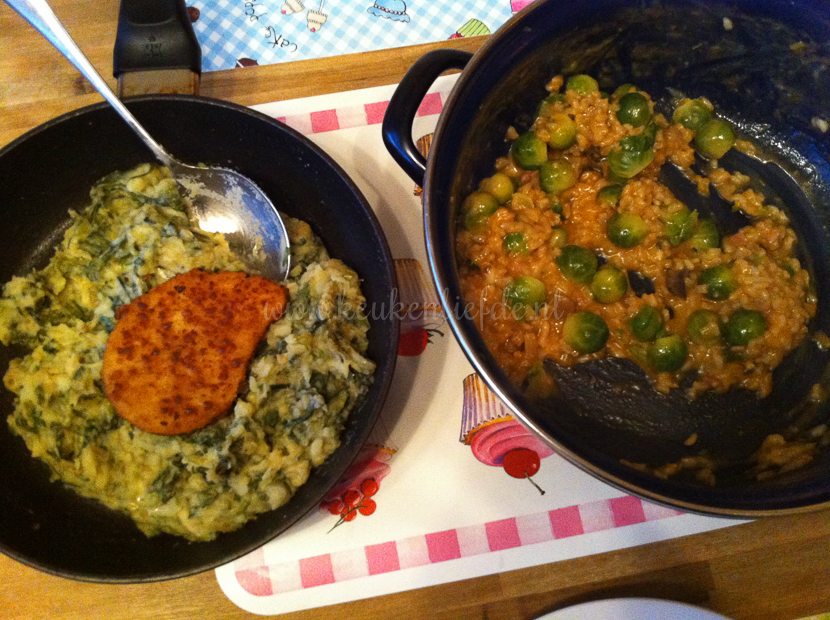 ’s Avonds eten we kliekjes: opgebakken andijviestamppot met jachtsaus, een Valess schnitzel en risotto met spruitjes. Wat een feest zo’n woensdag!
