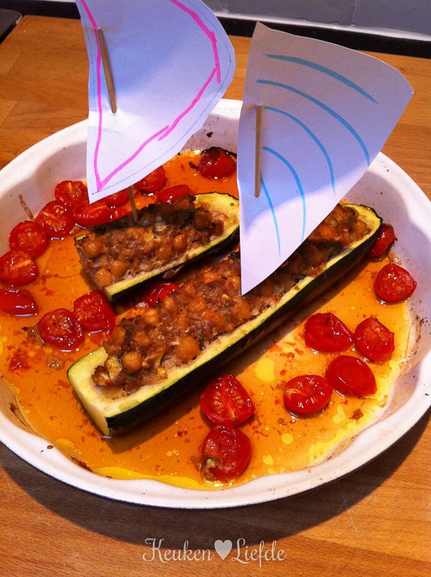 Nadat alle boodschappen zijn opgeruimd, gaan mijn dochter en ik aan de slag voor de kindercategorie Speels & Smakelijk. We maken courgettebootjes gevuld met gehakt en kikkererwten. Superlekker en gezond. Het recept komt morgen online.