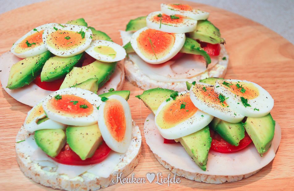 Rijstwafels met kipfilet, geitenkaas, avocado en ei