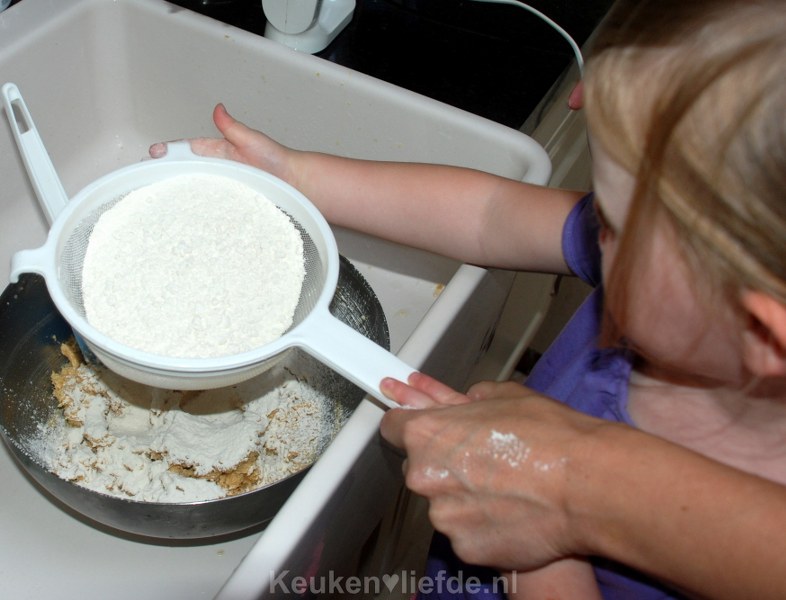 Meng de bloem met het bakpoeder en zout en zeef dit boven het botermengsel.