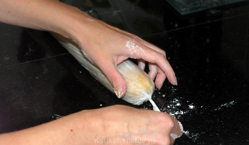 Roer de bloem door het beslag tot het is opgenomen. Leg een stuk vershoudfolie op het aanrechtblad en bestuif dit met wat bloem. Schep het beslag erop en rol met licht bebloemde handen tot een rol, lang genoeg om er straks 25 tot 30 plakken vanaf te snijden. Ahum, sommige dingen kun je beter nog even zelf doen…