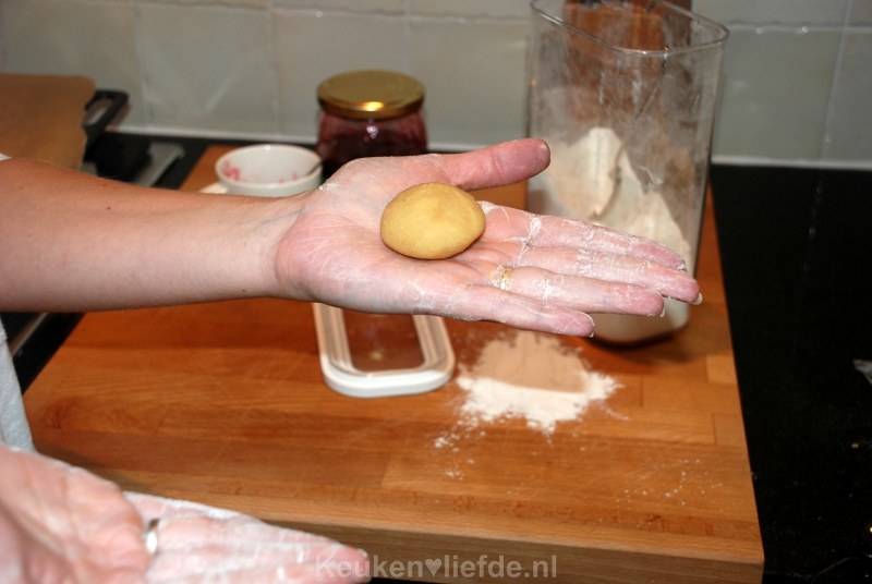 Leg de bolletjes op het bakblik en druk ze met je handen iets platter. De koekjes gaan door het bakpoeder tijdens het bakken behoorlijk uitzetten, dus zorg voor voldoende ruimte tussen de koekjes. Druk met een bebloemde vinger een holletje in elk koekje en vul deze met jam.