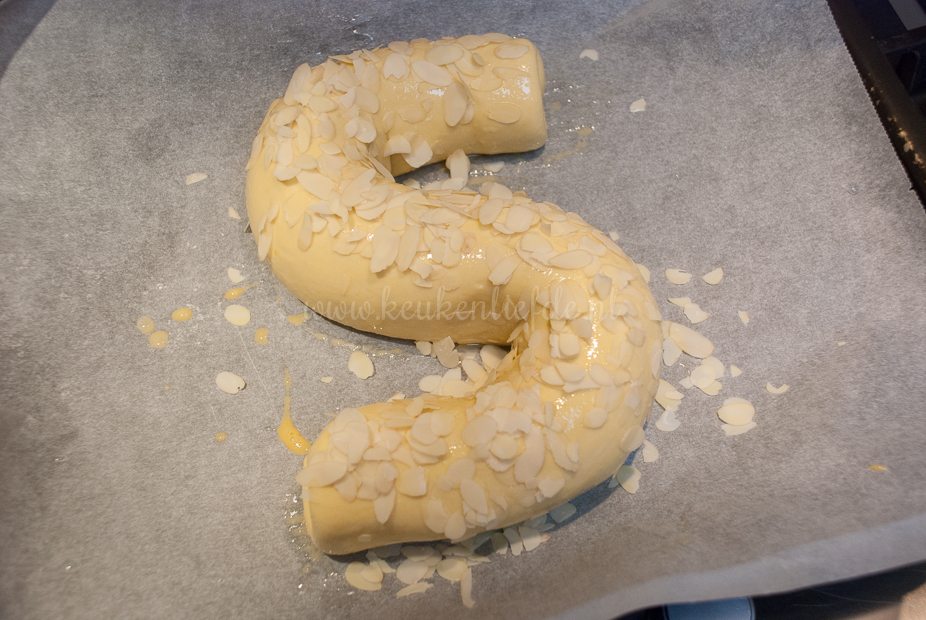 Schuif de banketletter in de oven en zet de temperatuur terug naar 180 graden. Bak circa 45 minuten in de oven, of totdat het bladerdeeg en de amandelen goudbruin zijn.
