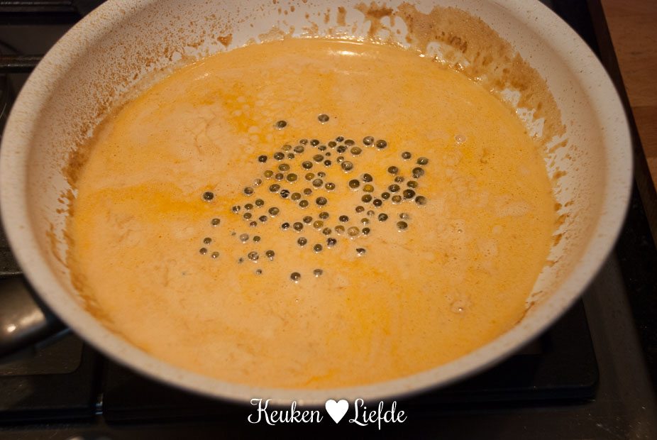Schenk de room erbij en laat de saus 1 tot 2 minuten zachtjes pruttelen. Voeg de peperkorrels toe en warm even mee.
