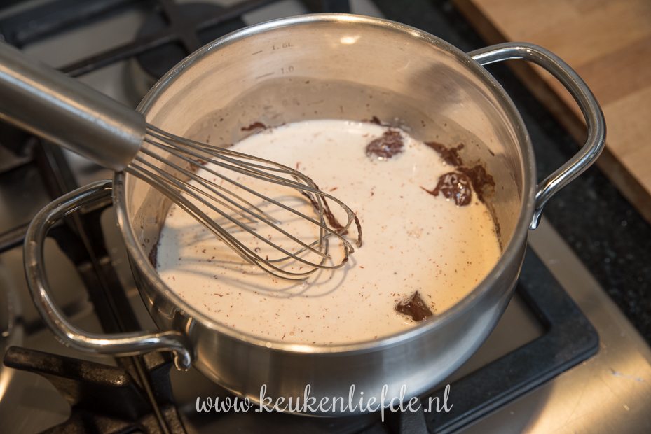 Verwarm de slagroom (niet laten koken, alleen verwarmen) en voeg al roerend de chocolade toe. Laat de chocolade al roerend smelten in de room. Voeg indien nodig een scheutje melk toe om de chocoladesaus wat dunner te maken. Roer tot slot de roomboter door de saus — hierdoor gaat de saus mooi glanzen.