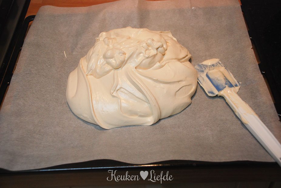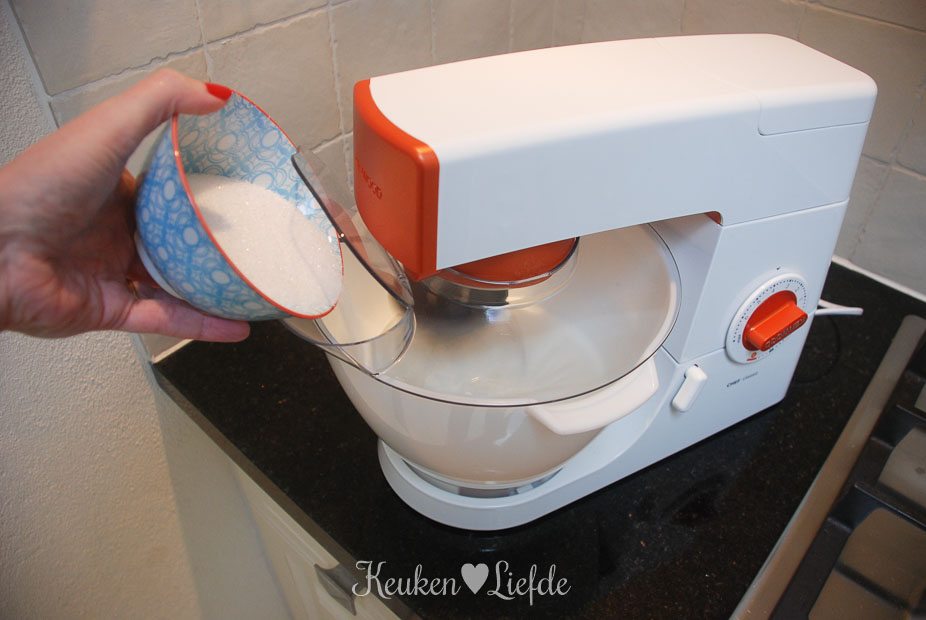 Klop in een andere kom (ik doe dit in de keukenmachine) de eiwitten stijf. Zodra het eiwit dikker begint te worden, voeg je geleidelijk de andere helft suiker toe en klop verder tot stijve, glanzende pieken.