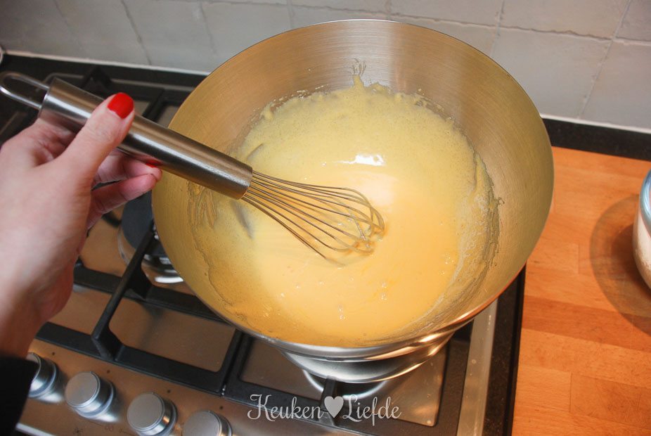 Verwarm de oven voor op 190 graden. Klop de eidooiers met de helft van de 300 g suiker au bain-marie, totdat het mengsel wat dikker begint te worden.