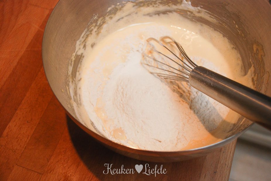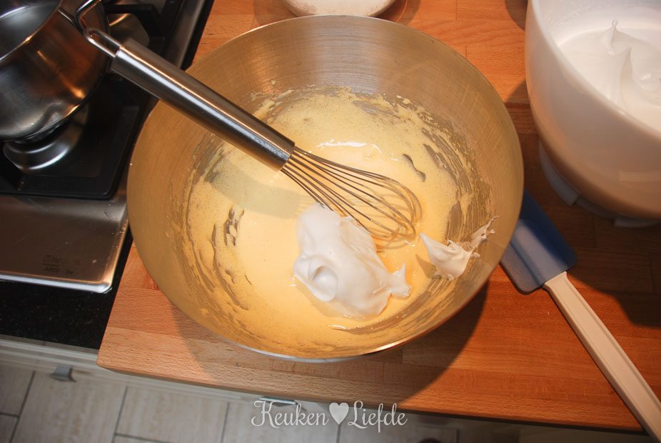 Spatel dan de bloem door de dooiers en voeg dit mengsel toe aan het overige eiwitschuim.