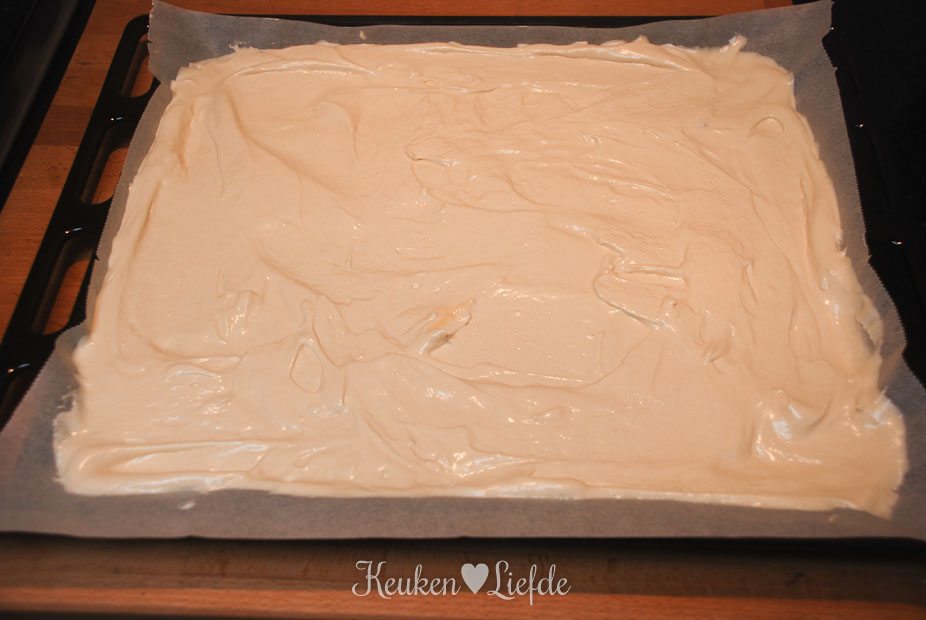 Bekleed een bakblik met bakpapier en spreidt het beslag uit over het bakpapier.