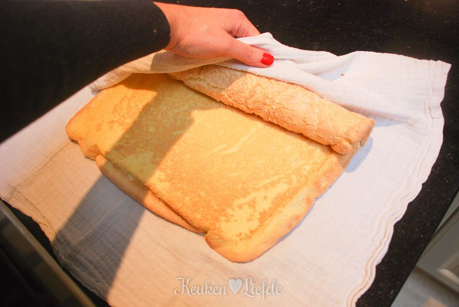 Dek de biscuitrol af met de theedoek en laat hem helemaal afkoelen.