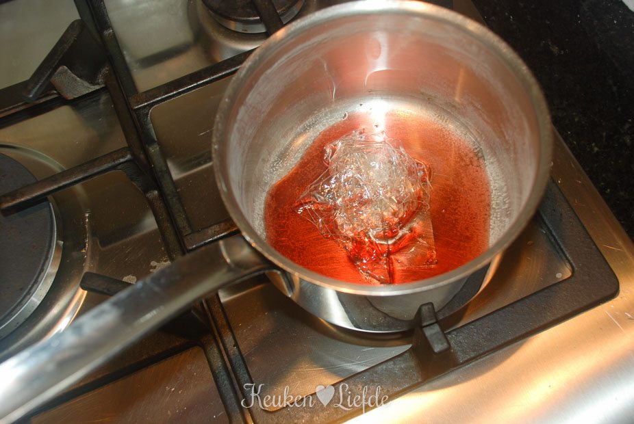 Voeg het gelatinemengsel al kloppend toe aan de slagroom en klop verder totdat de slagroom stijf is. Zet de slagroom afgedekt minimaal een uur in de koelkast.