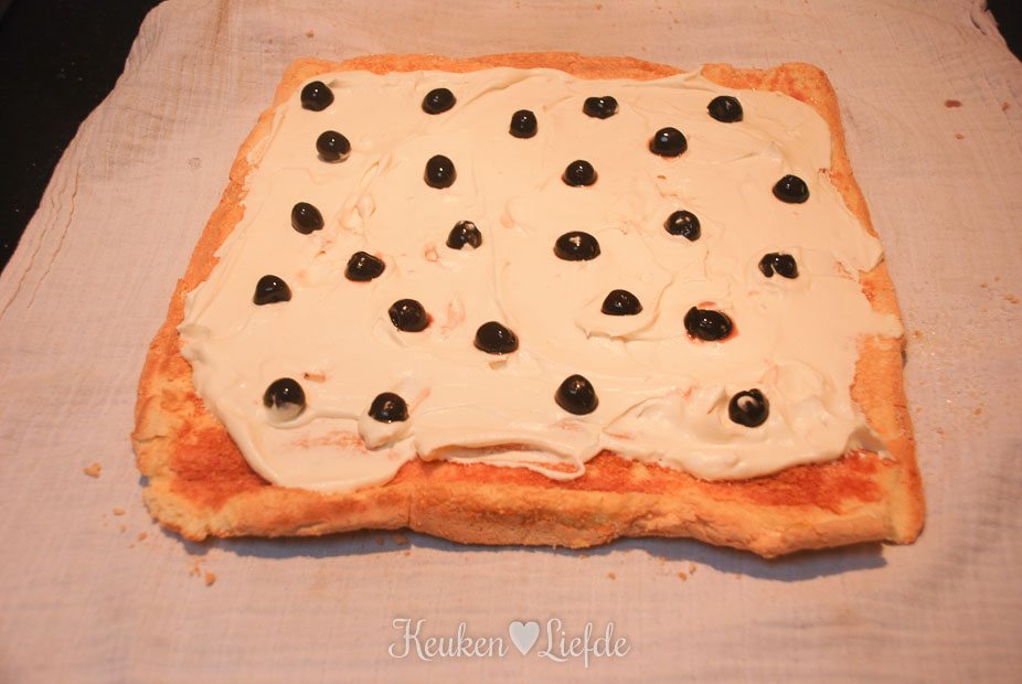 Rol de biscuitrol weer open en bestrijk de bovenkant met 2/3 van de slagroom, houd de randen van de rol vrij. Verdeel de kersen over de slagroom (houd circa 10 kersen achter voor garnering) en rol de biscuitrol zo netjes en zo strak mogelijk weer op.