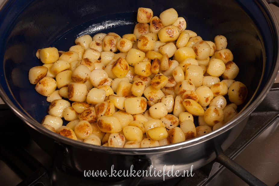 Bak de gehaktballetjes op hoog vuur rondom goudbruin, maar nog niet helemaal gaar. Schep ze op een bord en zet opzij. Bak in dezelfde pan de krieltjes goudbruin en gaar.
