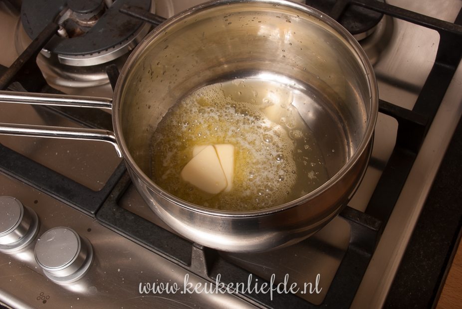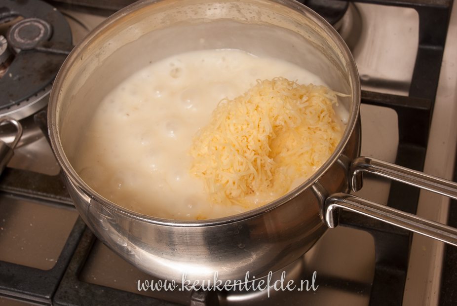 Smelt de boter in een sauspannetje en voeg de bloem toe. Roer met een garde door. Laat de bloem op laag vuur een minuut meegaren. Voeg dan beetje bij beetje en al roerend het kookvocht, de melk of een combinatie van beiden toe. Verwarm totdat de saus gebonden is. Voeg de kaas toe en roer totdat de kaas gesmolten is en je een gladde kaassaus hebt. Breng eventueel verder op smaak met zout en peper en eventueel een snuf nootmuskaat.
