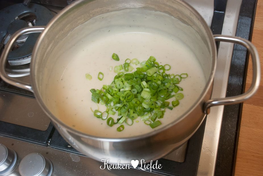 Verhit een kook- of sauspan met de boter en laat smelten. Voeg de bloem toe en roer circa een minuut goed met een garde, om de bloem te laten garen. Verkruimel de bouillontablet erover en voeg de melk en het opgevangen kookvocht van de bloemkool toe. Blijf goed roeren, totdat je een gladde en gebonden saus hebt. Roer de helft van de geraspte kaas erdoor, totdat deze is opgenomen en voeg dan de overige lente-ui toe. Zet het vuur uit.