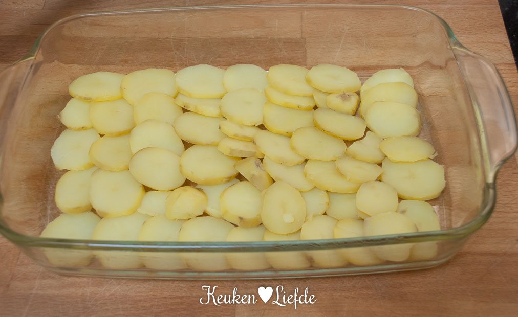 - 600 g voorgekookte aardappelschijfjes, kant-en-klaar of zelf koken*