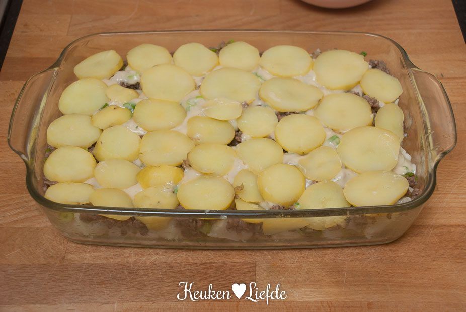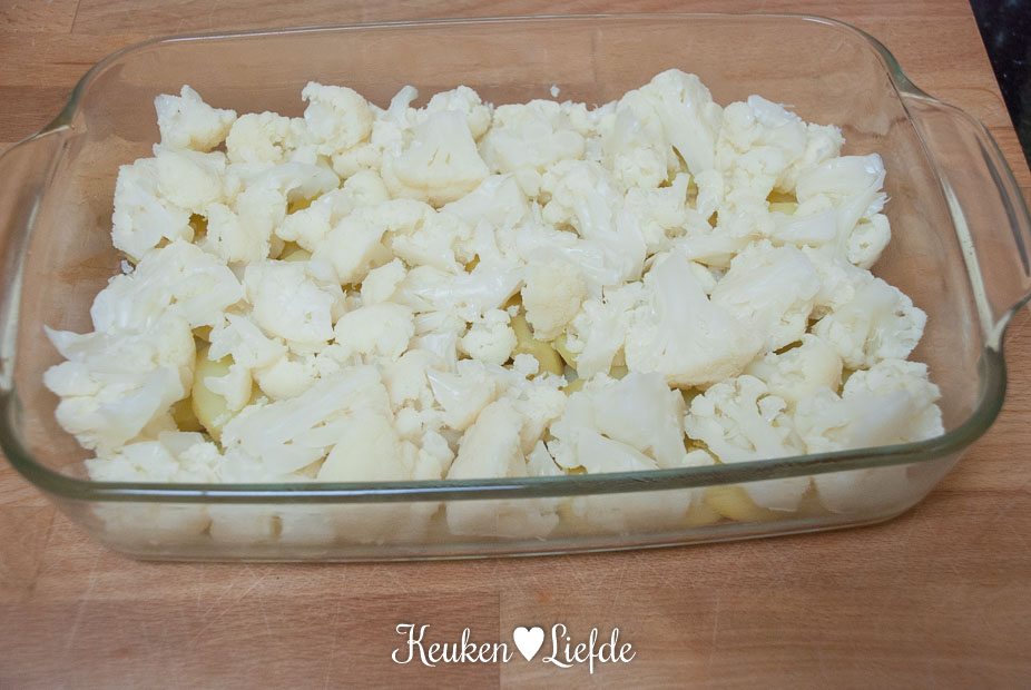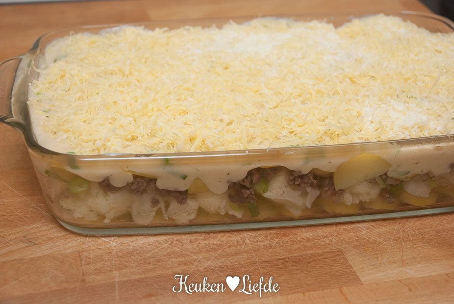 Bedek de bodem van de ovenschaal met de helft van de aardappelschijfjes, gevolgd door de bloemkool en het gehakt. Verdeel de helft van de saus erover en bedek met de overige aardappelschijfjes. Verdeel de resterende saus over de aardappels en bestrooi met de geraspte kaas.