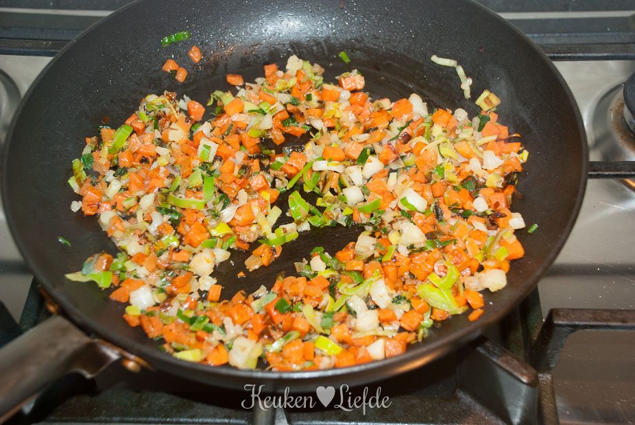 Verhit de koekenpan met wat olie en bak de soepgroenten beetgaar. Breng op smaak met zout en peper. Schep de groenten op een bord en veeg de pan schoon met een stukje keukenpapier.