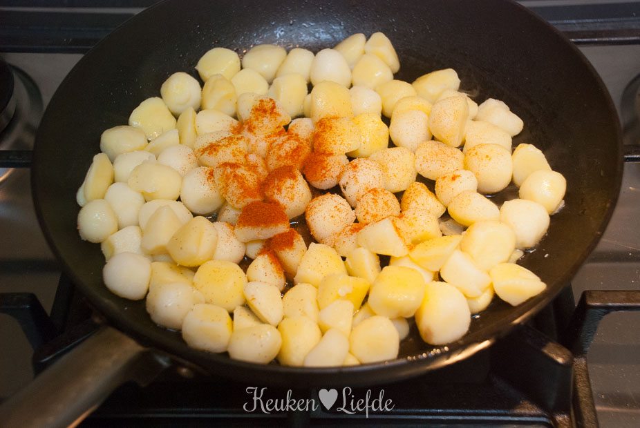Verhit de koekenpan opnieuw met wat olijfolie en bak de krieltjes op middelhoog vuur goudbruin. Breng de krieltjes op smaak met paprikapoeder, zout en peper. Voeg het ontbijtspek toe als de krieltjes bijna gaar zijn en bak even mee, totdat het spek uitgebakken is.