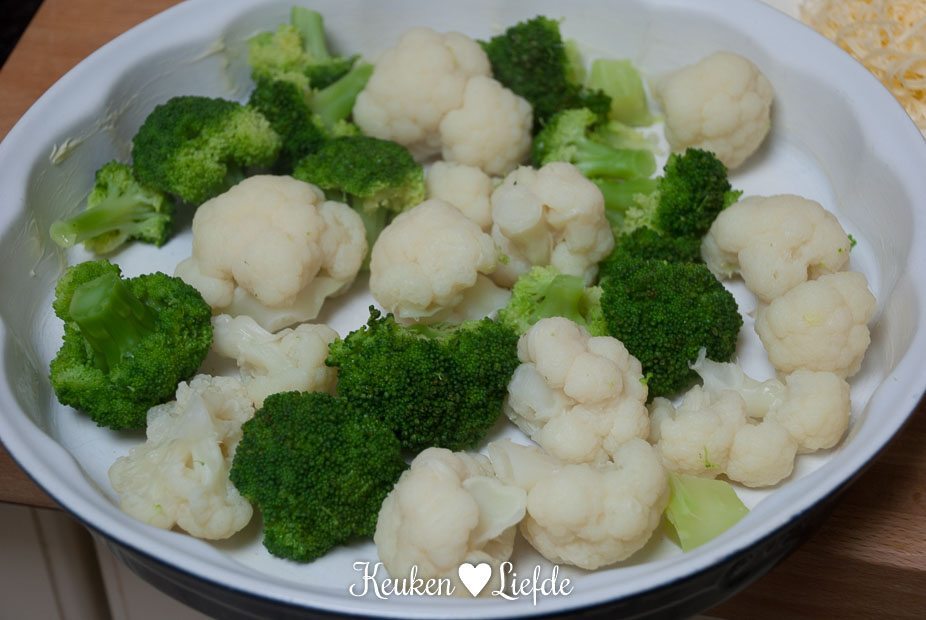 Verwarm de oven voor op 200 graden. Breng water met wat zout aan de kook en voeg de bloemkoolroosjes toe. Kook 2 minuten en voeg dan ook de broccoliroosjes toe. Kook nog 3 minuten verder, of totdat de bloemkool en broccoli beetgaar zijn. Giet af, vang 100 ml kookvocht op, en laat de broccoli en bloemkool goed uitlekken. Verdeel ze over een ovenschaal.