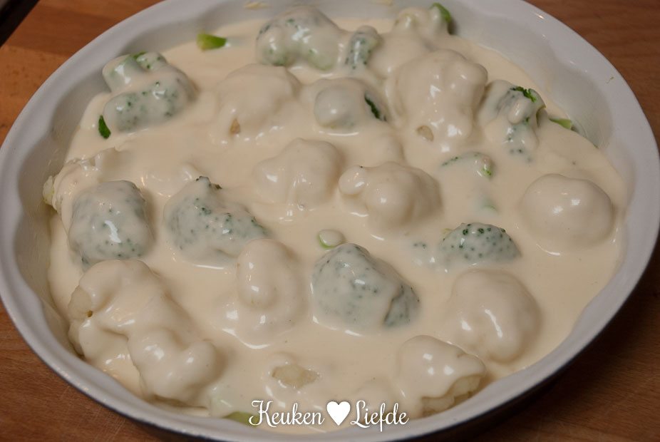 De kleine broccoli en bloemkool wilde ik een beetje pimpen. Maar hoe? Voordat ik mezelf die vraag gesteld had, dreef er al een zee van kaassaus voor mijn blauwe oogjes. (Ik heb het al aan talloze dokters gevraagd, maar genezing van de Rozekaasbrilziekte is onmogelijk. Help.) De kale groenten overgoot ik daarom rijkelijk met romige kaassaus en gratineerde ik in de oven. Dit is pimpen à la KeukenLiefde: gezond en een tíkkeltje ondeugend. Heerlijk!
