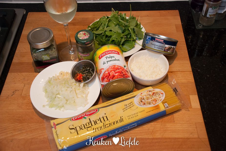 Serveer de spaghetti met de tomaten- en tonijnsaus en garneer met een flinke toef rucola. Besprenkel indien gewenst met wat extra olijfolie en bestrooi met Parmezaan. Serveer direct.