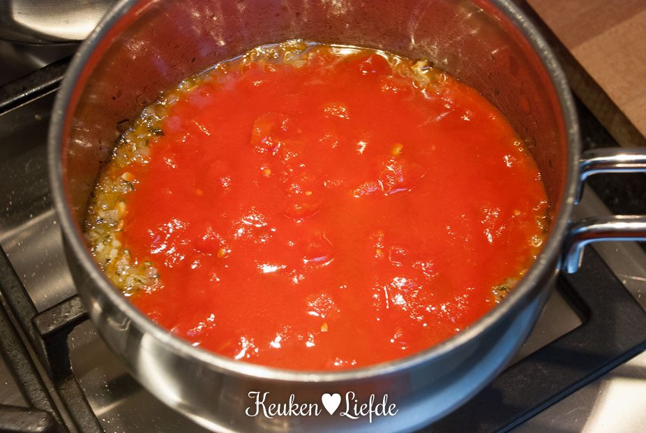 Zet het vuur hoog en blus de ui af met de witte wijn. Laat inkoken, totdat de wijn bijna verdampt is. Voeg de tomatenstukjes toe, zet het vuur weer lager en laat enkele minuten zachtjes pruttelen. Breng op smaak met een snuf suiker, peper en zout.