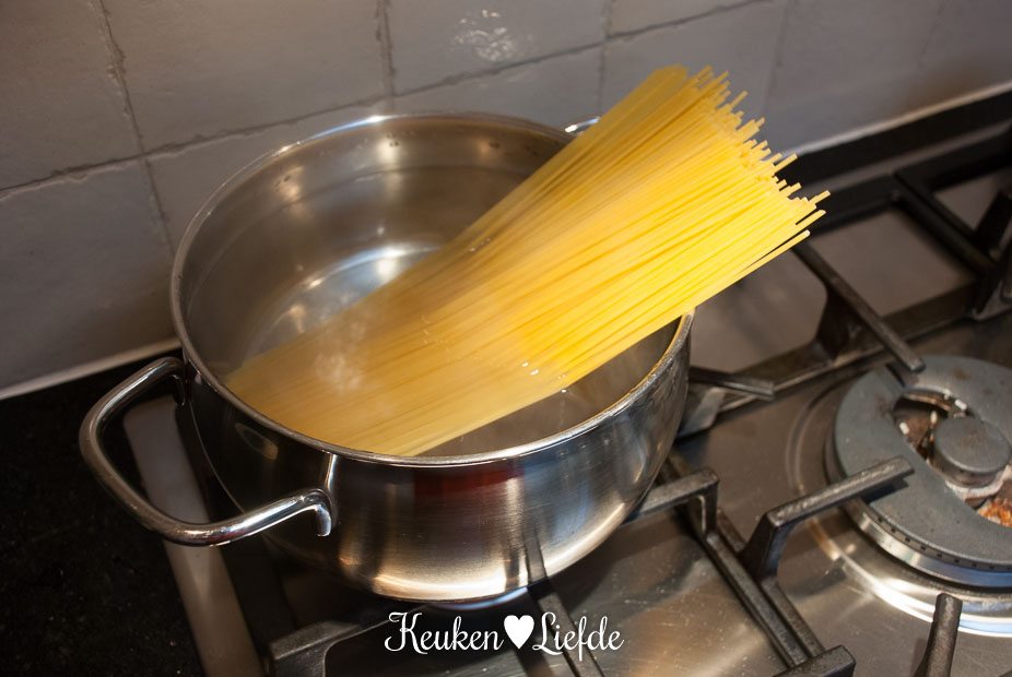 Breng een ruime pan met water aan de kook voor de pasta. Voeg zodra het water kookt wat zout en de spaghetti toe en kook beetgaar volgens de omschrijving op het pak.