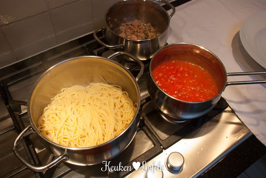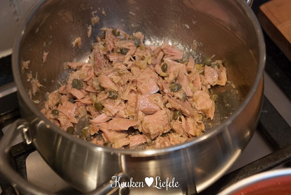 Even een vraag over bovenstaand recept: Wanneer en hoe maak ik de tonijn warm? Ik kan het niet vinden in het recept, alleen dat ik het warm moet houden.