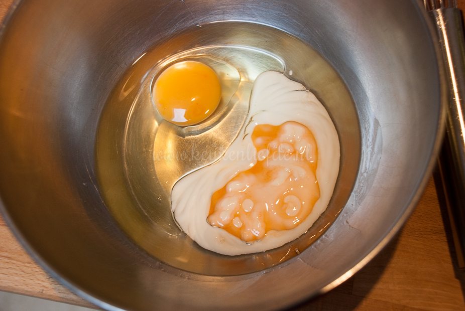 Doe de olie, yoghurt, ei en vanille in een kom en klop goed door elkaar.