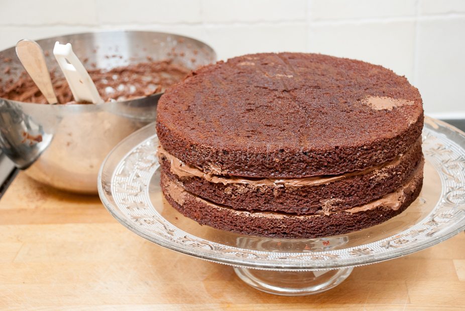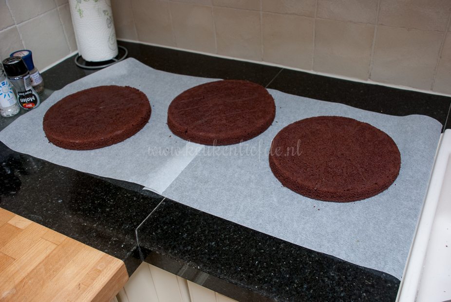Besmeer een taartbodem met een laagje chocoladecrème (niet te dik, anders houd je niet genoeg over voor de rest van de taart) en leg de tweede taartbodem erbovenop. Besmeer opnieuw met een laagje chocoladecrème en dek af met de derde taartbodem. Bestrijk de boven- en zijkant van de taart met de overige chocoladecrème.