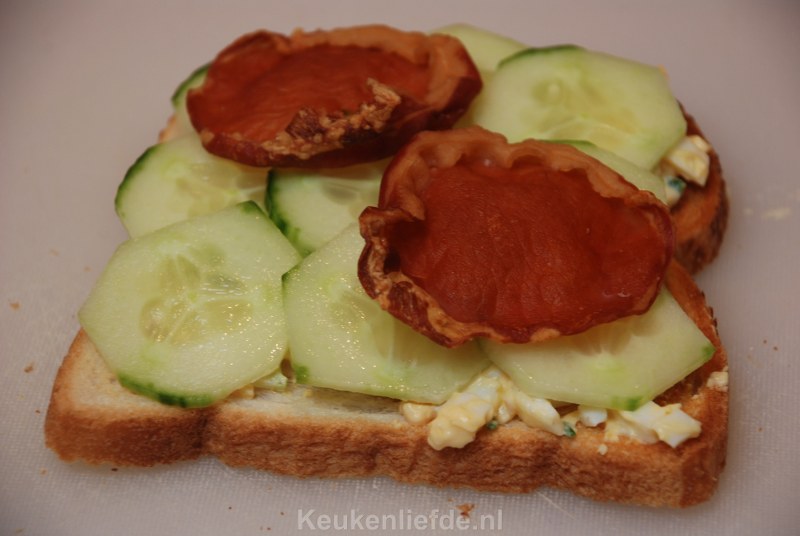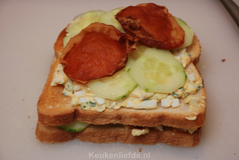 De eiersalade maakte ik zelf en smaakt echt veel beter dan de fabrieksversie uit de winkel. Je hebt vele versies van de club sandwich en eerder maakte ik ook deze heerlijke klassieker met gerookte kip, bacon, plakjes hardgekookt ei, sla en tomaat.