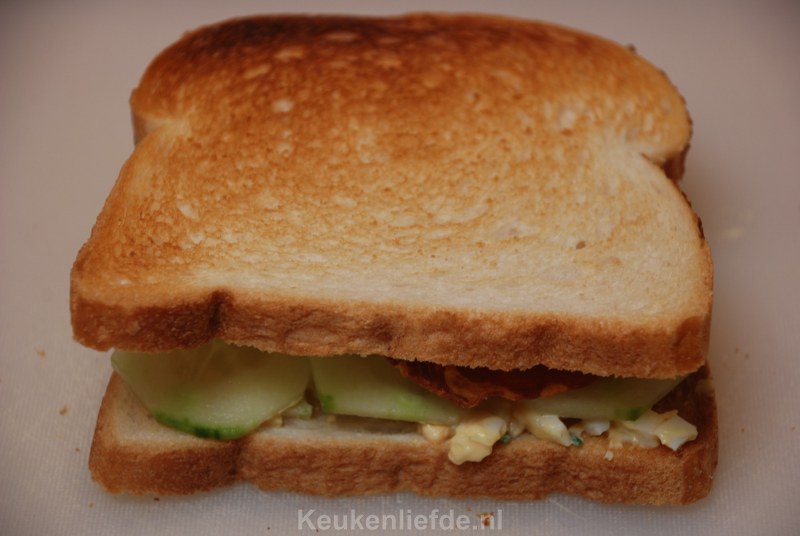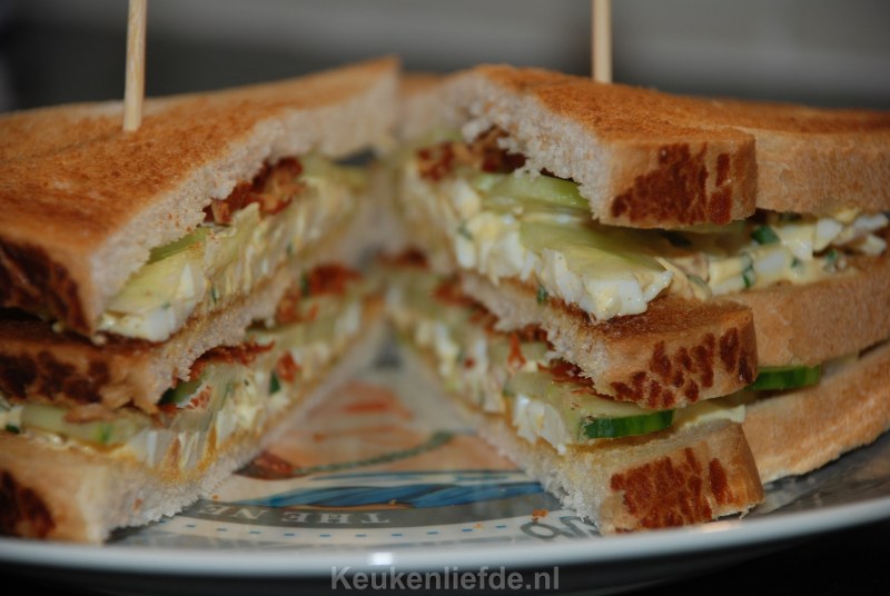 Deze club sandwich met eiersalade, knapperig uitgebakken bacon en plakjes komkommer is een heerlijk lunchgerecht. Trouwens ook een goed idee om in de picknickmand te stoppen en er buiten op een mooi plekje van te genieten.