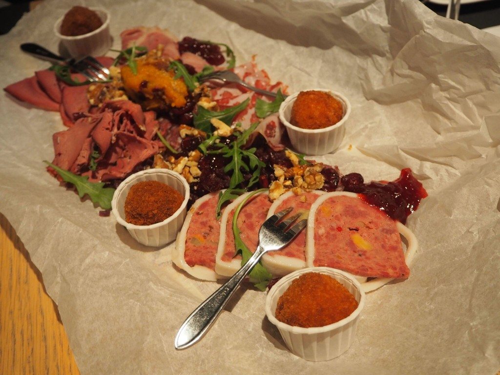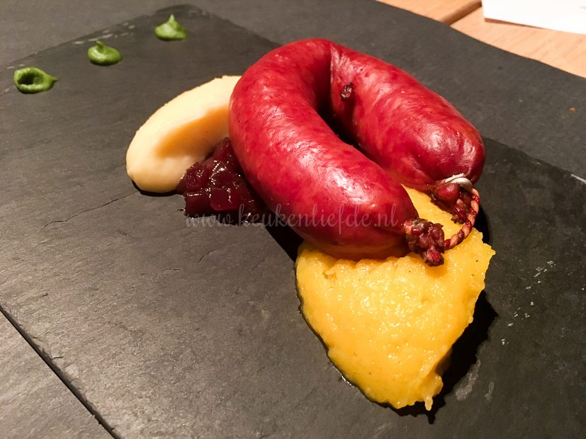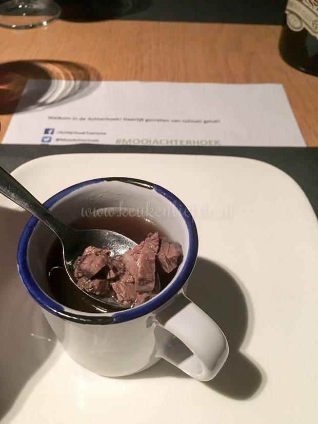 Onze bus brengt ons naar de volgende stop in de Achterhoek: de DRU Cultuurfabriek in Ulft. In dit cultureel centrum vind je een theater, een poppodium, een muziekschool, een bibliotheek en een Turks cultureel centrum. Wij schuiven aan voor een meergangen (na alle bieren en wijnen die deze avond rijkelijk vloeiden ben ik ergens de tel kwijtgeraakt) wildproeverij in Grand café Het Schaftlokaal. Dat je hier heerlijk (wild) kunt eten bewijzen de foto’s. Ik begin spontaan weer te watertanden …