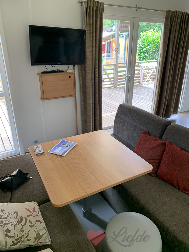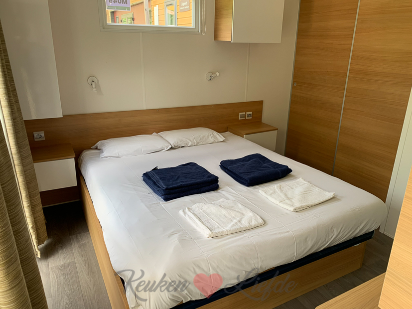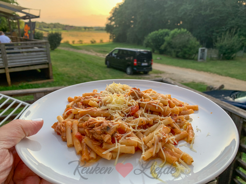 Maandag: Omdat Ella-Marie afgelopen zaterdag jarig was en haar verjaardag vierde, konden we zondag de tassen inpakken en maandag vertrekken. Dat is gelukkig geen probleem. Ook in het hoogseizoen kun je bij Eurocamp zelf je aankomst- en vertrekdag bepalen, zonder daar meerkosten voor te betalen. Na een redelijk rustige autorit van 11 uur rijden we ’s middags om drie uur de camping op. Goed getimed want nadat we de sleutel hebben opgehaald bij de Eurocamp medewerkers kunnen we direct onze caravan in. We verblijven in de Aspect caravan: de meest luxe stacaravan van Eurocamp met onder andere een groot buitenterras, ruime keuken met zithoek, 3 ruime slaapkamers en een ruime badkamer. Ella-Marie is door het dolle heen want er is ook een slaapkamer met stapelbed! Als alle spullen zijn opgeruimd hijsen we ons in de zwemkleding en plonsen nog even in het zwembad. Aaaah, daar knapt een mens van op na zo’n lange autorit! Ik vertrek iets eerder uit het zwembad omdat ik nog even wat spulletjes wil halen in het campingwinkeltje. Ik koop onder andere een zak pasta, een ui, knoflook, een fles tomatensaus, een blikje tonijn en wat kaas om zelf een lekker pastaatje te maken vanavond. (Een makkelijke variant van dit recept.) Snel klaar en lekker! Na het eten wandelen we nog een rondje over de camping om de boel te verkennen. Wat heel fijn is aan deze camping is dat alle voorzieningen en activiteiten centraal bij elkaar zitten: de receptie, zwembaden, speeltuin, kidsclub, speelhal, het restaurant en het campingwinkeltje. Helaas is het mobiele bereik op de camping heel slecht waardoor je geen gebruik kunt maken van je eigen netwerk en ook met de internetkaart die we ter plekke aanschaffen om gebruik te maken van de campingwifi was het internet dramatisch slecht. Aandachtspuntje wat ons betreft.