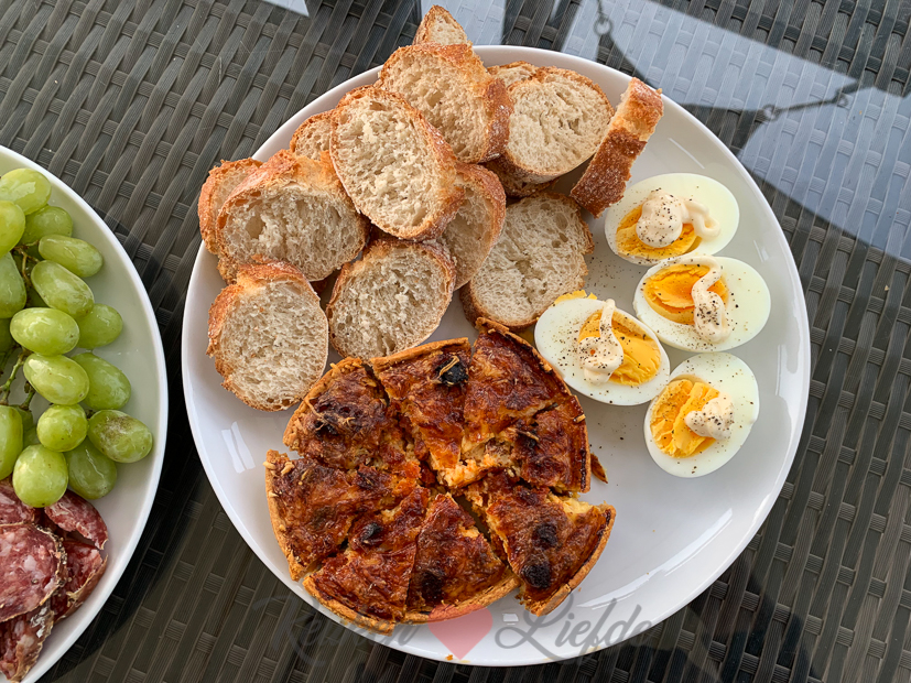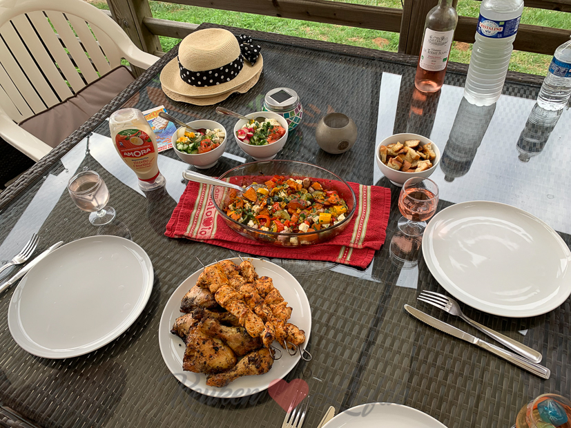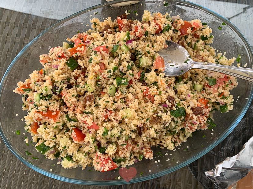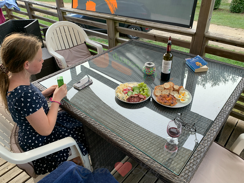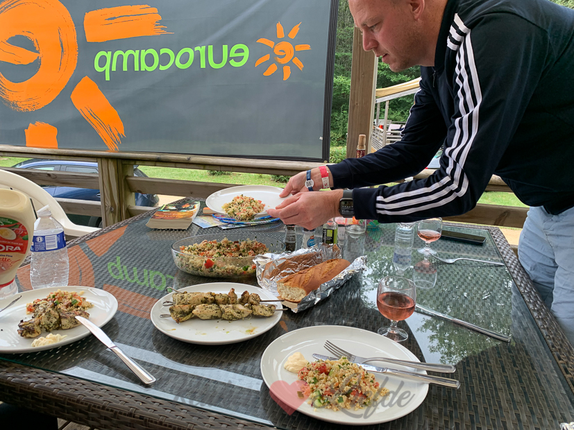 Dinsdag: We ontbijten met Franse croissants en chocoladebroodjes uit het campingwinkeltje. Deze worden elke dag vers afgebakken en zijn verrukkelijk! Daarna rijden we naar het dorpje Le Bugue dat vlakbij de camping ligt om over de markt te wandelen. Ik koop een leuk rugtasje, Ella-Marie twee armbandjes en natuurlijk worden er wat lokale lekkernijen zoals quiches, worsten, kaas en walnotentaart in geslagen. Daarna doen we nog boodschappen in de plaatselijke hypermaché en rijden we weer terug naar de camping. Als Johan en Ella-Marie nog even naar het zwembad zijn tref ik alvast wat voorbereidingen voor het avondeten. Ik maak een lekkere tabouleh salade (dit recept) en daarbij grillen we gemarineerde pesto kipspiezen op de barbecue (die zit bij de caravan inbegrepen). Een vers afgebakken stokbroodje maakt het campingsmulfeest compleet. 🙂 Na het eten gaan we nog een potje tafeltennissen en daarna doen we nog een potje kaarten.