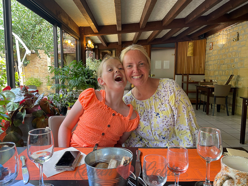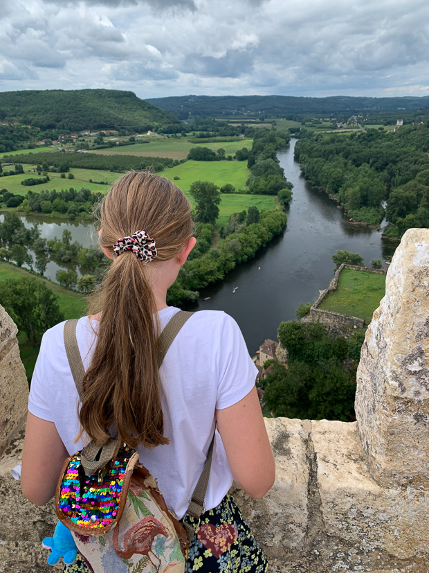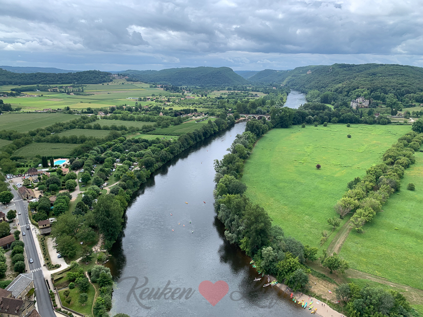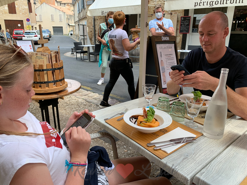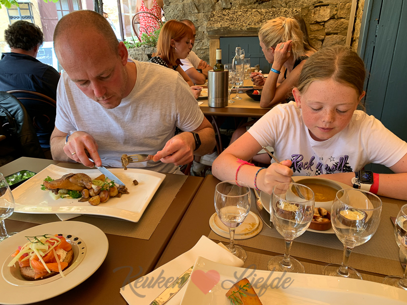 Woensdag: We gaan ‘s ochtends al vroeg op pad om een bezoekje te brengen aan kasteel Chateau de Beynac. Vanuit het ondergelegen dorp Beynac-et-Cazenac kun je omhoog wandelen (het is een flinke klim) naar het kasteel. We klommen helemaal naarboven in het prachtige kasteel bovenop de rots en werden beloond met een prachtig uitzicht over de rivier De Dordogne en de heuvelachtige omgeving. Wauw! Toen we weer beneden in het dorp waren zochten we een restaurantje op om te lunchen. We streken neer in restaurant La Petite Tonnelle wat een hele dikke aanrader is! Daarna rijden we terug naar de camping en gaan we nog even zwemmen. Rond half negen zetten we een hapjesplank op tafel in plaats van avondeten en spelen we nog een potje tafeltennis op de camping.