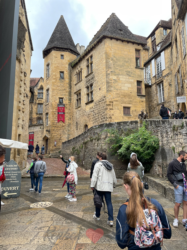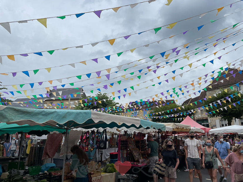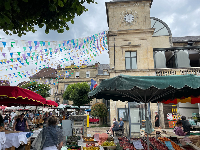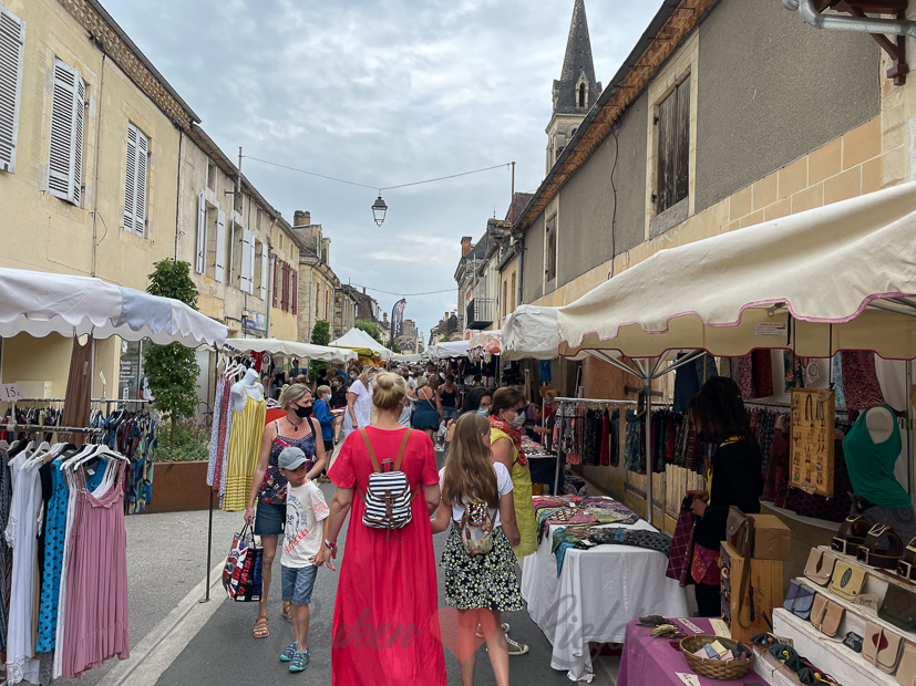 Zaterdag: Na het ontbijt stappen we in de auto en rijden naar de markt in het middeleeuwse stadje Sarlat. Daar zijn we enkele jaren geleden al eerder geweest tijdens de vakantie en waren hier erg van gecharmeerd. Omdat het steeds harder gaat regenen als we over de markt lopen zoeken we snel een droog plekje op waar we kunnen lunchen. Na de lunch is het gelukkig droog en wandelen we verder over de markt. Ik koop een mooie gevlochten boodschappentas en Ella-Marie koopt ook een rugtasje. Daarna rijden we weer terug naar de camping. ’s Avonds halen we pizza in het afhaalrestaurant op de camping. Het is niet echt lekker weer om buiten te eten dus eten we hem binnen in de caravan op.