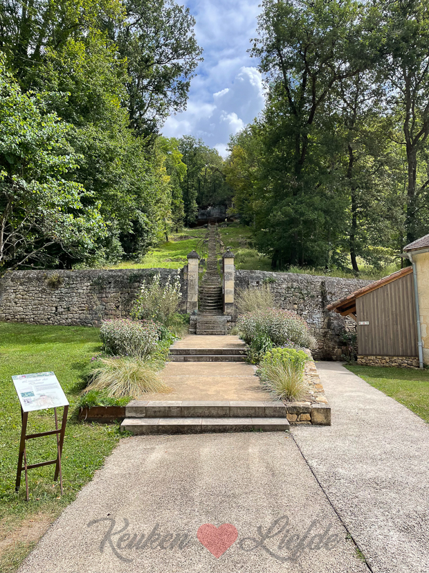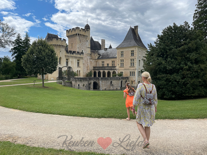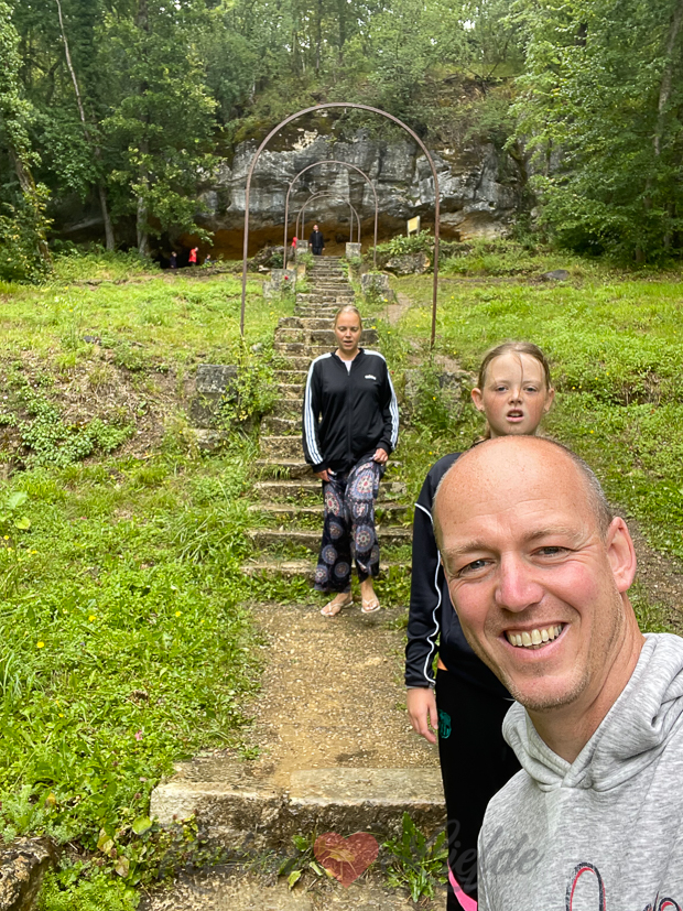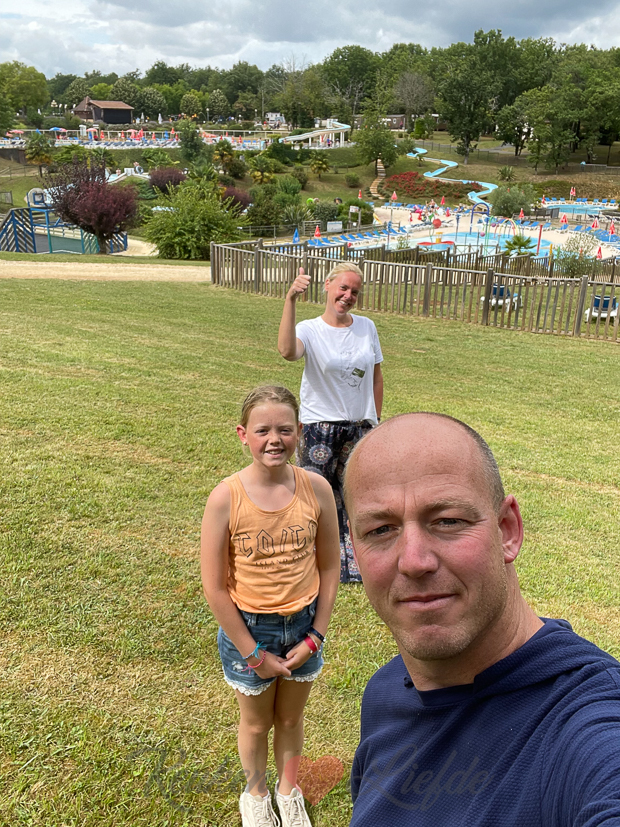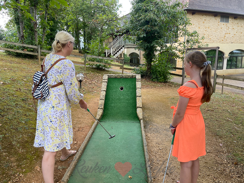 Zondag: Na wederom een ontbijt binnen in de caravan (buiten miezert het en is het fris) met croissants en chocoladebroodjes stappen we in de auto. Het plan was om door het dorpje Le Bugue te wandelen, maar het ziet er zo uitgestorven uit dat we doorrijden. Onderweg komen we langs een mooi chateau met prachtige tuinen die allebei open zijn voor bezoekers. Via de tuin kom je bij lange trappen waar je omhoog kunt klimmen naar een rotswand. Omdat we vandaag avontuurlijk zijn ingesteld gaan we ervoor. Helaas waren mijn teenslippers het enige schoeisel dat ik deze vakantie had meegenomen en ik had ook geen jas of trui meegenomen (ik noem het optimisme, Johan noemt het gemakzucht 🤷🏼‍♀️). Op mijn teenslippers, gekleed in lange flodderbroek en in de Adidas trainingjas van Johan (ik zie eruit als een tokkie) begin ik samen met Johan en Ella vrolijk de klim omhoog. Slingerend over een smal bospad klimmen we omhoog want het uitzicht schijnt prachtig te zijn. Na een half uur klimmen zijn we bijna bij de top als de hemelsluizen openbreken. Op gierende teenslippers strompelen, glijden en sliden we weer naar beneden. Dat uitzicht hebben we uiteraard niet gezien. Als verzopen tokkies (ik vooral) staan we 15 minuten later weer beneden in de kasteeltuin. Omdat de modder in mijn oren zit besluiten we terug te rijden naar de camping om ons om te kleden. Daarna rijden we weer terug naar het kasteel om te lunchen in het restaurantje dat bij het kasteel zit. Daar lekker gegeten en daarna alsnog een fijne wandeling door de kasteeltuin gemaakt. Daarna rijden we weer terug naar de camping. Mini me heeft de hele week al zin in een potje midget golf dus vooruit, we doen het. Net als we de eerste bal willen slaan breken de hemelsluizen weer open. Dubbel kak. We schuilen onder een boom tot het droog is. Omdat dat niet gebeurt rennen we in de regen naar het campingrestaurant om daar de bui verder af te wachten. Als het eindelijk droog is kunnen we dan eindelijk gaan midget golfen. Enig was het. Vooral toen mini me de bal niet in het gat kreeg en op het punt stond te verliezen. Berg je maar, daar is een bergafdaling op je teenslippers in de stromende regen niks bij. Uiteindelijk binnen in de caravan opgewarmd en begonnen met het inpakken van de koffers. Morgenvroeg rijden we weer naar het altijd zonnige Holland. Wist je trouwens dat Eurocamp de Gratis Mooi Weer Garantie heeft? Bij slecht weer boeken ze op jouw verzoek de vakantie gratis om naar een andere camping, waar de zon wel schijnt. Superfijn natuurlijk als je echt voor een zonvakantie gaat. Omdat wij er graag op uit gaan waren de temperaturen van afgelopen week voor ons helemaal prima. We hebben (meestal dan) genoten!
