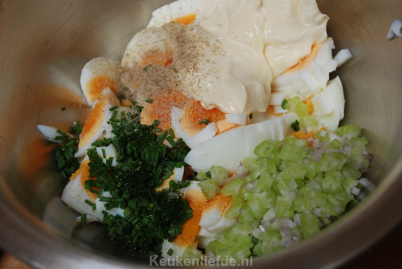 Na het maken en proeven van vele verschillende recepten ben ik uiteindelijk zelf tot dit recept gekomen. De bleekselderij geeft een heerlijke kruidige smaak en de bieslook en het sjalotje geven een zachte en subtiele uiensmaak. Erg lekker! Wil je een light variant van deze eiersalade vervang dan de mayonaise door (volle) yoghurt.