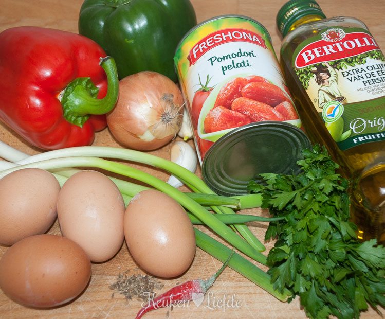 Bestrooi de shakshuka vlak voor serveren met de lente-ui en peterselie en serveer met lekker brood.